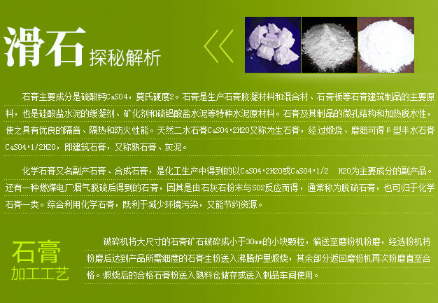石膏主要成分是硫酸鈣CaSO4,莫氏硬度2。石膏是生產(chǎn)石膏膠凝材料和混合材、石膏板等石膏建筑制品的主要原料,也是硅酸鹽水泥的緩凝劑、礦化劑和硫鋁酸鹽水泥等特種水泥原材料。石膏及其制品的微孔結(jié)構(gòu)和加熱脫水性,使之具有優(yōu)良的隔音、隔熱和防火性能。天然二水石膏CaSO4.2H2O又稱為生石膏,經(jīng)過煅燒、磨細可得β型半水石膏CaSO4.1/2H2O,即建筑石膏,又稱熟石膏、灰泥。
