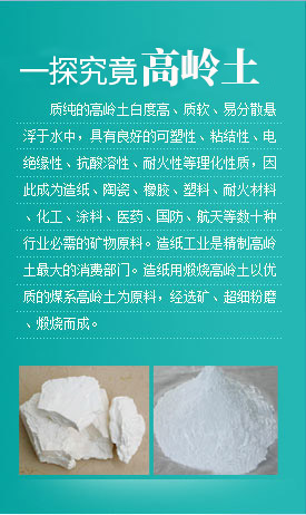 質(zhì)純的高嶺土白度高、質(zhì)軟、易分散懸浮于水中,具有良好的可塑性、粘結(jié)性、電絕緣性、抗酸溶性、耐火性等理化性質(zhì),因此成為造紙、陶瓷、橡膠、塑料、耐火材料、化工、涂料、醫(yī)藥、國防、航天等數(shù)十種行業(yè)的礦物原料。造紙工業(yè)是精制高嶺土大的消費部門。造紙用煅燒高嶺土以品質(zhì)良好的煤系高嶺土為原料,經(jīng)選礦、超細粉磨、煅燒而成。