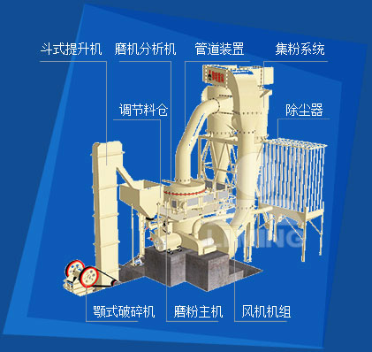 大塊非金屬礦經(jīng)顎式破碎機破碎后,由斗式提升機送至儲料倉,通過電磁振動給料機均勻連續(xù)地送入磨粉機主機內(nèi)研磨,研磨后的粉末在鼓風(fēng)機的作用下吹向選粉機進行分選。符合細度的非金屬礦粉由管道輸送到儲料倉;不合格的粒子重回磨粉機內(nèi)研磨。整個系統(tǒng)在負壓狀態(tài)下運行,粉塵不外溢,從而保護了周邊環(huán)境。若經(jīng)脈沖除塵器過濾,環(huán)保效果更佳。